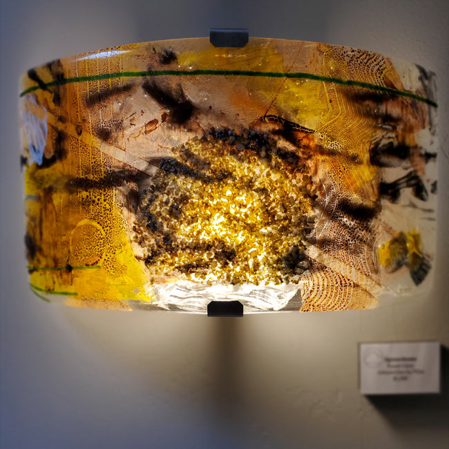 Named for the bold diagonal glass rod that cuts across its surface, Szewron draws the eye with movement and momentum. Layers of earthy tones, shadowy sweeps, and subtle textures create a sense of quiet energy — like a whisper of wind across stone.